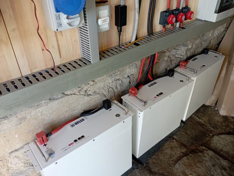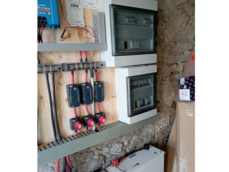 The installation consists of 14 430Wp UFLEX panels installed on two independent strings. The two strings are managed by two Victron Energy SmartSolar charge controllers.