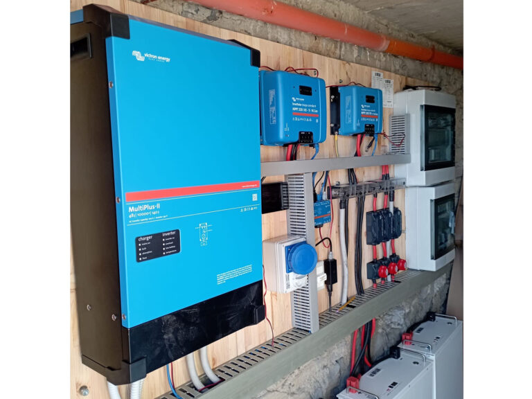 The Victron Energy 48/10000 inverter instead provides alternating current inside the home.